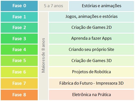 Criamos uma metodologia onde oferecemos aos alunos conhecimento amplo através de uma trilha de pedagógica que começa aos 5 e vai até os 16 anos de idade. Durante esta jornada os alunos aprenderão a criar Games, fazer Apps para celular, Sites, Robôs e muito mais.